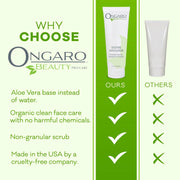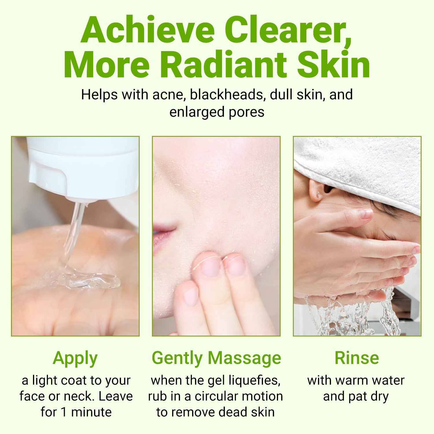 Do not wet your face first. Apply a light coat to your dry face and neck area and leave on for about a minute so the fruit enzymes have time to work. You'll know it's ready when the gel liquifies on your skin. Then rub in a circular motion in order to remove the dead skin. You will feel and see small balls of skin forming under your fingers. Don't worry, no matter how long or hard you rub, it will only remove the dead skin and no more. Pat dry with a towel. Follow with Ongaro Moisturizer and Eye Crème for best results. Use 2-3 times per week.